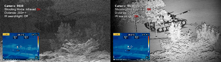 The author simulated night conditions by photographing a cold, stationary tank in a forest at 200 meters using both thermal and low-light optical imaging. The thermal image failed to clearly identify the vehicle, while the passive optical sensor struggled with target classification—especially problematic given that both sides in the conflict use Russian equipment. With IR illumination, however, the tank’s shape and features became distinct, enabling confident identification. This simulation reinforces the battlefield feedback.