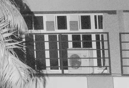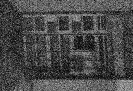 A camera in a dark night using high ISO to capture an image 100 meters away. The picture is full of noise and graininess, the object's outlines are broken, and details are difficult to identify. The plants on the left are almost unrecognizable.