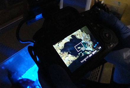 Fluorescent signal can be detected by observation through image filter mounted on ring light (Fig 7). The same signal can be previewed or recorded via DSLR display (Fig 8). Thus, signals with extremely low intensity can be detected via long exposure. Furthermore, discrepancies from human judgment can be avoided. Since photo parameters can be shared and standardized, consequently, data exchange among laboratories become feasible.