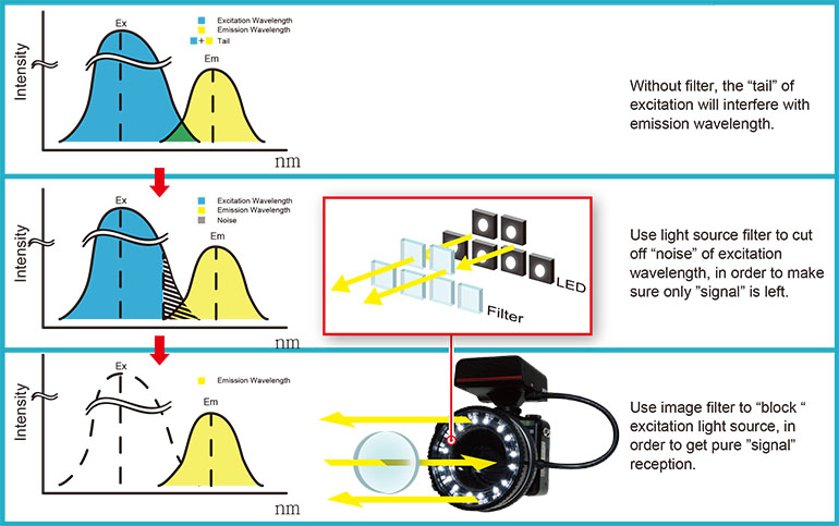 3. Image filter : In order to improve contrast of signal/noise ratio, the purpose of the image filter is to filter out excitation light from emission signals.