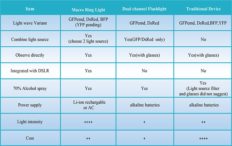 The ring light used in this study can be powered by AC and rechargeable Li-ion battery which provide flexibility in observation. When powered by AC, a turbo feature can deliver stronger excitation energy which may be helpful to detect low level fluorescent protein.