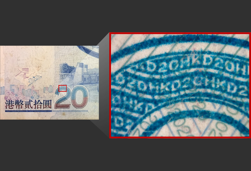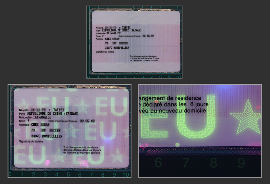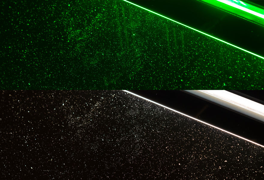 Searching for alien particles / scratch inspection on mask with pellicle. Comparison : (Upper) Under 4000K White Light can find dust; (Bottom) Under collimated green light can see other particles.