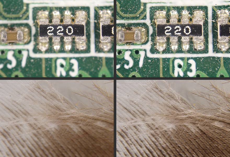 Inspectors could find sticky dust particles on Optical Lens efficiently. Comparison: (Upper left) lens under ambient light ; (Upper right) lens under 4000K white light unqualified.