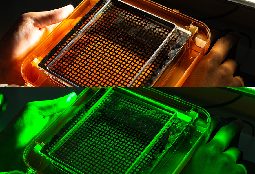 Dual color light switching base on various work demands. Warm white light will not affect exposure work.Under collimated green light, Human eyes have high contrast sensitiveness to see fine dust and particles.