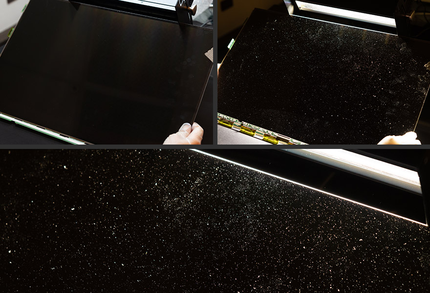 Inspectors could find sticky dust particles on LCD efficiently. Comparison: (Upper left) lens under ambient light ; (Upper right) lens under collimated 4000K white light seem unqualified.